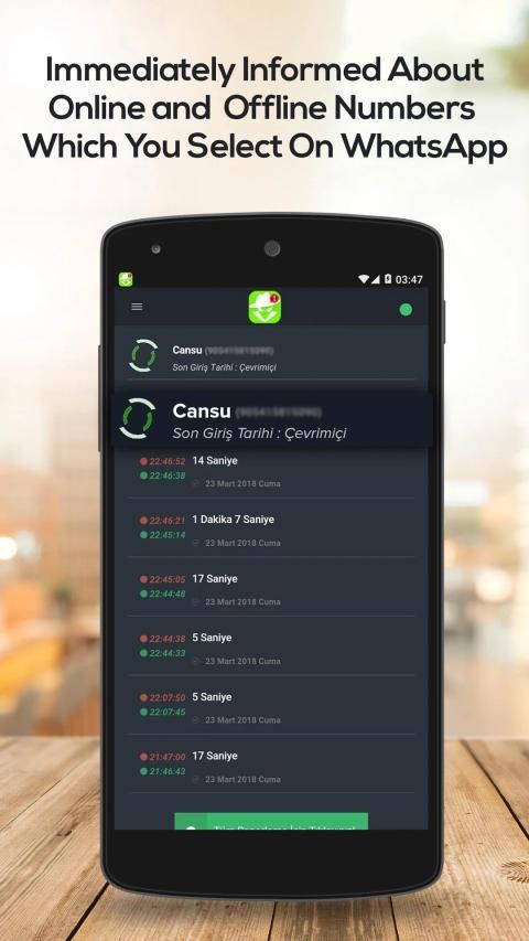 Asisten terbaik Anda dalam pelacakan waktu online terakhir terlihat. Kami akan menunjukkan kepada Anda WhatsApp online untuk terakhir kalinya, tunjukkan semua statistik WhatsApp online untuk Anda! Penggunaan aplikasi pelacak WhatsApp online - apa yang Anda butuhkan! Dengan izin Anda, kami akan memberi tahu Anda tentang pro dan kontra dari profil tersebut. Di pelacak WhatsApp kami, Anda dapat mengubah suara notifikasi menjadi yang Anda inginkan untuk setiap profil. Kapan saja Anda dapat menarik perjanjian aplikasi dan tidak menggunakan aplikasi kami, data disimpan pada protokol yang aman, semuanya aman!