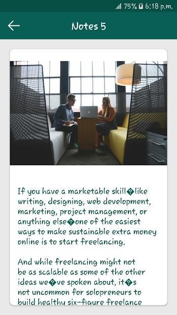 app detailed explanation about every money making idea, skills you need, the time required and our helpful handpicked guidance tips.
