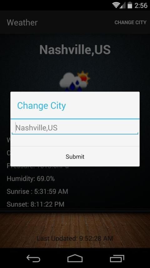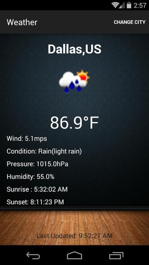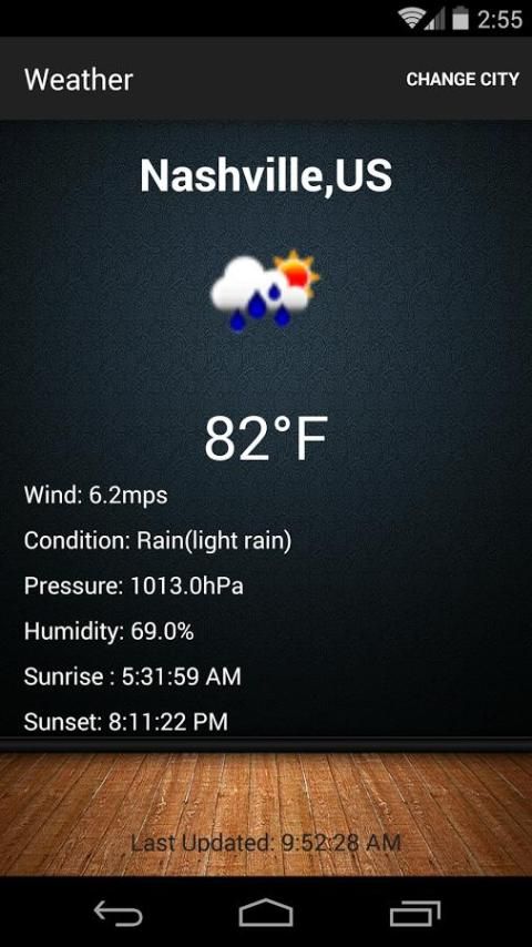 Cuaca App adalah aplikasi cuaca sederhana dari lebih dari 200.000 kota dan berkembang. Aplikasi ini membuatnya sangat mudah untuk menemukan kondisi cuaca saat ini dari mana pun Anda berada. Cuaca App masih belum sepenuhnya keluar dari produksi, tapi masih memberikan data yang akurat. Aplikasi cuaca memungkinkan pengguna memilih dan mengubah lokasi mereka dengan kota, dan menyediakan suhu instan, kelembaban, tekanan, kondisi, kecepatan angin, dan matahari terbit dan terbenam. Yang harus Anda lakukan adalah mengklik "Ganti Kota" tombol di bagian kanan atas layar Anda dan ketik lokasi Anda. Lokasi harus diketik dalam format yang sama seperti yang ditunjukkan oleh teks gelap dalam pengaturan. ex. (Nashville, AS) Silahkan Komentar dan Rate, umpan balik Anda selalu membantu. Terima kasih.