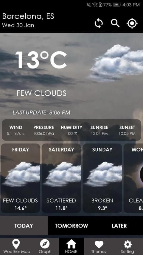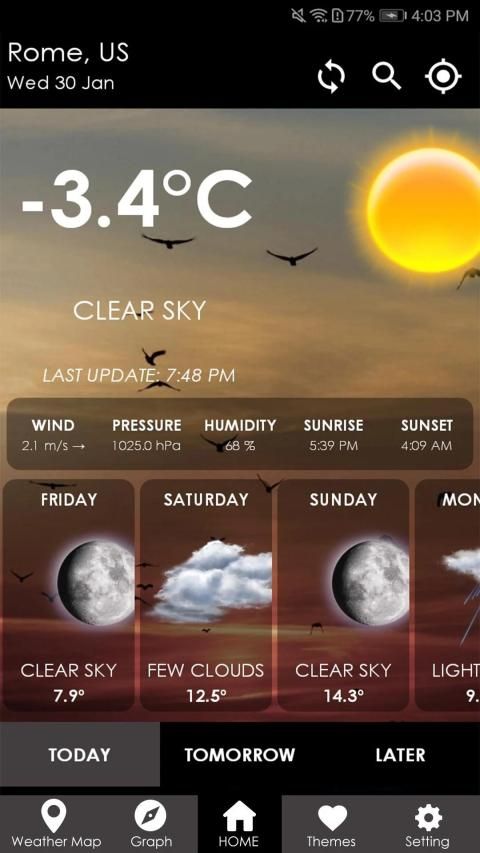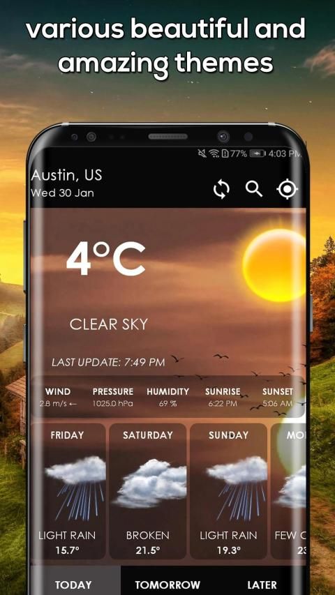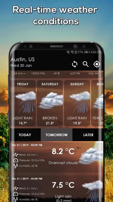 ☀️ This daily weather app weather channel display current temperature, daily and hourly weather forecasts, sunrise and sunset time, humidity, wind speed and air pressure with weather today & weather tomorrow hourly weather app.