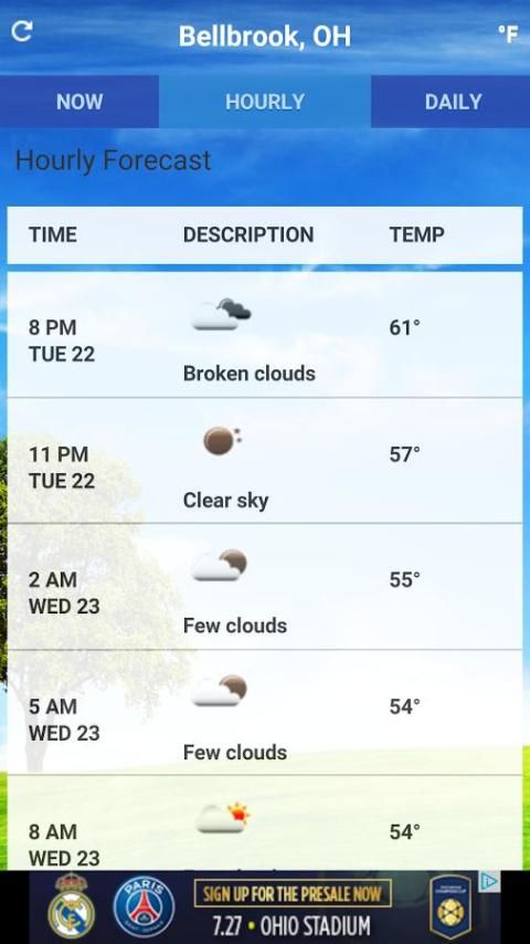 Prakiraan Cuaca App menunjukkan pengguna saat ini, per jam dan ramalan cuaca harian.
