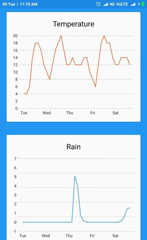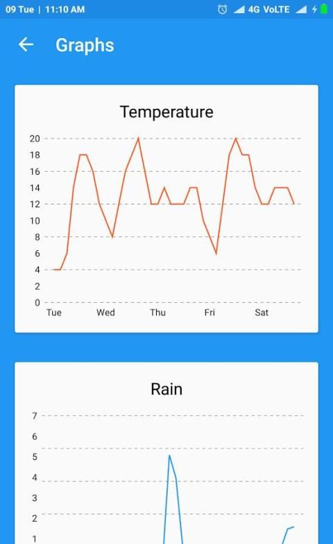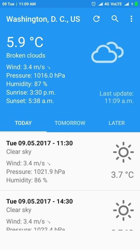 Ini mencari alamat Anda secara otomatis, dan menyediakan suhu saat ini dalam Celcius dan Fahrenheit. Hal ini juga memberikan kondisi saat cuaca, kelembaban relatif, tekanan atmosfer, jarak visibilitas, curah hujan di menyatukan yang berbeda, Indeks ultraviolet (UV index), titik embun, kecepatan dan arah angin, selain sepuluh hari ramalan masa depan dan ramalan cuaca per jam. Aplikasi ini juga menyediakan matahari terbit dan terbenam sesuai dengan zona waktu kota. Anda juga dapat mengikuti Status fase bulan selama satu jam saat ini dan selama 5 hari ramalan.