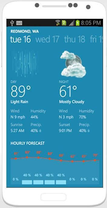 - Menunjukkan angin, kelembaban, tinggi dan rendah suhu dan informasi angin untuk lokasi Anda saat ini