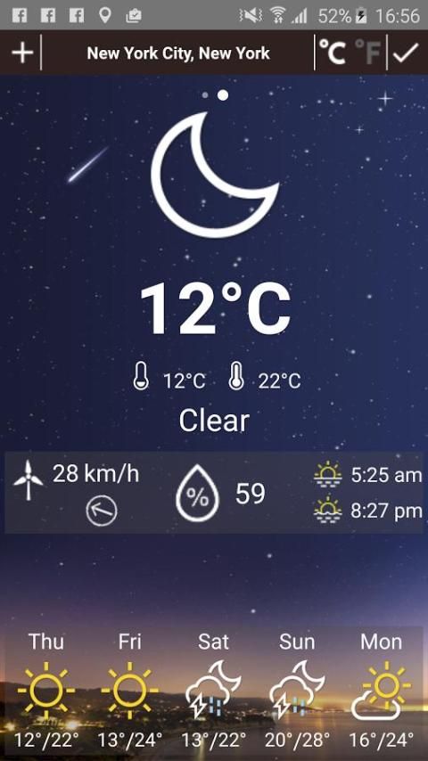 Anda dapat melihat ramalan cuaca di lokasi manapun di dunia. Cuaca widget menyediakan antarmuka yang sangat jelas dan indah dengan setiap jenis cuaca.