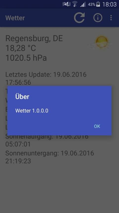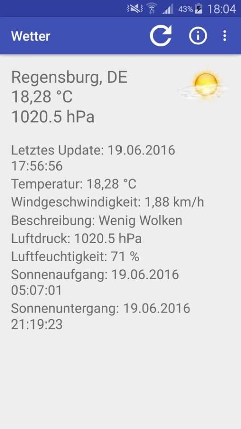 Aplikasi untuk menampilkan cuaca saat ini untuk kota Anda (dengan informasi rinci tentang kecepatan angin, suhu, kelembaban, ...).