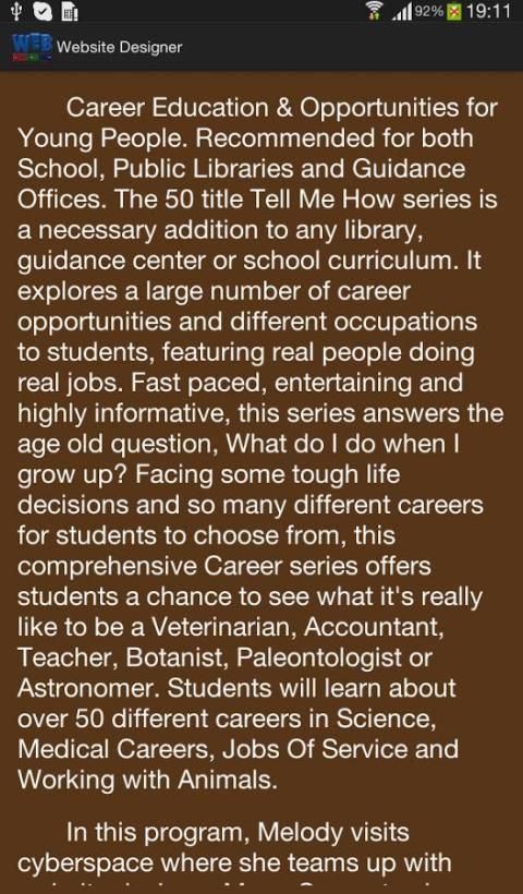 Dalam aplikasi ini, Melody kunjungan dunia maya di mana dia tim dengan desainer website Mona Currey untuk menunjukkan apa yang dapat Anda lakukan dengan pengetahuan kerja computers.Subjects Covered Sertakan: Website desain sebagai karier. Mengapa komunikasi penting untuk seorang desainer website? Apa jenis pelatihan yang diperlukan untuk menjadi seorang desainer website? Bagaimana desainer website belajar tentang world wide web? Adalah belajar pemrograman komputer penting? Apa jenis kelas yang Anda butuhkan untuk mengambil di sekolah untuk menjadi seorang desainer website? Apakah perguruan tinggi penting untuk seorang desainer website? Bagaimana seorang desainer website mendapatkan klien mereka? Mengapa web di seluruh dunia penting bagi bisnis? Berbagai jenis website dan desainer?