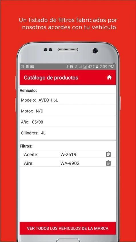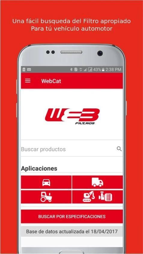 Web Filtros es una amigable aplicación diseñada para ayudar a los usuarios finales, mayoristas o distribuidores de filtros para aceite, combustible, aire y refrigerante a encontrar el filtro marca Web apropiado para su vehículo o maquinaria. Puedes buscar partiendo del tipo y marca de tu vehículo, código de filtro de una marca competidora o especificaciones técnicas. También puedes buscar los detalles de un producto marca Web de tu interés, así como recomendaciones para la instalación de los mismos. Una vez que la base de datos se descarga en tu equipo, lo puedes usar sin conexión a la red de datos. La base de datos se actualiza automáticamente.