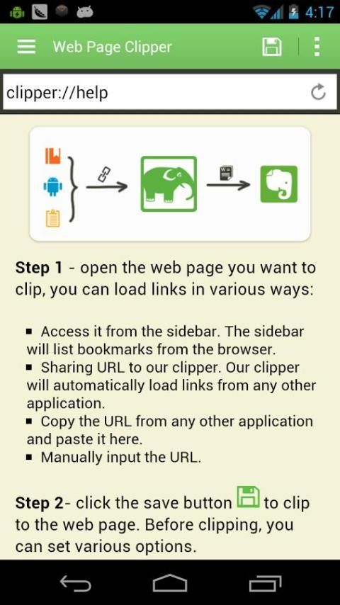 Halaman Web Clipper Trial (untuk Evernote) menawarkan pengalaman pengguna yang konsisten pada semua ponsel Android dan tablet. Ini mencakup banyak desain khusus untuk sistem operasi Android.