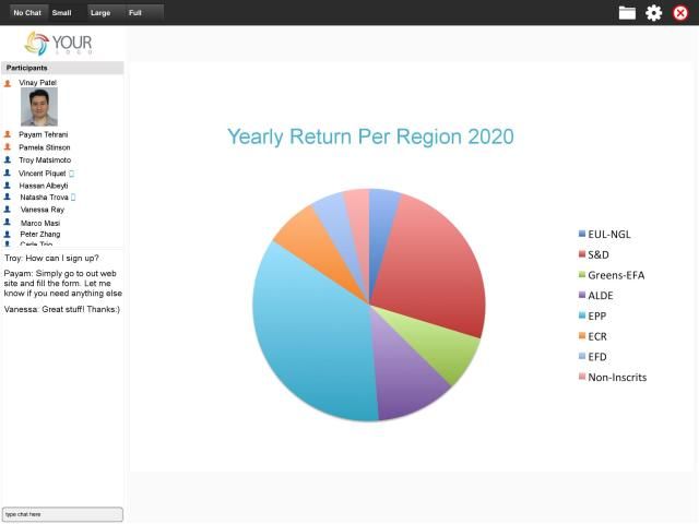 Fitur berikut diaktifkan: suara hidup, chatting, polling, slide, melihat pangsa layar, folder dokumen, papan tulis, pemutar video termasuk video YouTube, pemutar musik, Cobrowser, pengumuman, Notes, hidup berbagi halaman web dan eCurtain.