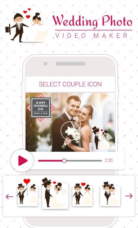 Pernikahan Foto Video pembuat aplikasi memiliki fitur Happy Wedding Frames. Anda dapat membuat video menggunakan foto, menambahkan musik ke video, mengedit foto digunakan untuk video, menambahkan frame pernikahan ke video, kecepatan set frame rate video foto Anda.