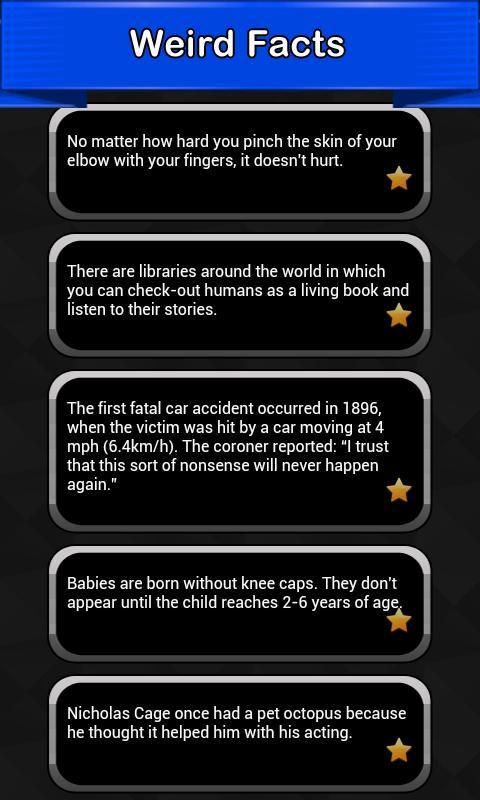 Cari dan download aplikasi ke HP kamu dari toko aplikasi. 30,000+ Pengguna mendownload Weird Facts versi terbaru di 9Apps secara gratis! Ini akan memberikan informasi kepada pemain gila lainnya. Aplikasi HOT ini di rilis tanggal 2017-01-10. Selain itu, anda juga dapat memilih aplikasi terkenal lainnya yang anda suka disini !
