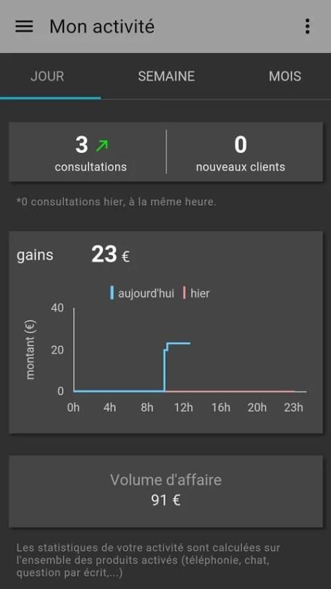 Tinjau bulan activitities: Keuntungan, jumlah konsultasi, pembeli baru ... Cari rincian per hari, minggu, atau bulan; grafik pembuangan memungkinkan Anda untuk mengikuti evolusi kegiatan Anda.