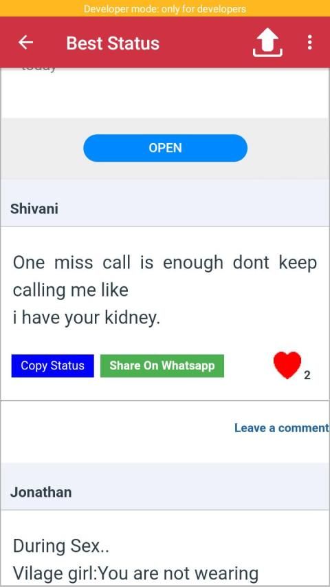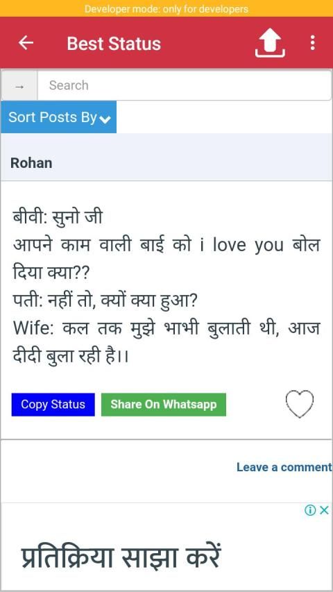 The best whatsapp status app helps you stay in touch with family and friends. Whatsapp status app is a great collection of jokes, messages, quotes, sad status, funny status, romantic status and much more, Get latest love messages/wishes/quotes/jokes from its huge categories. There is more than 10 status categories which gives to complete freedom to choose messages/quotes according to your mood or occasion. and also you can use hashtag to search your favourite status,,