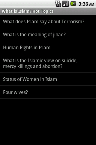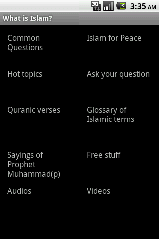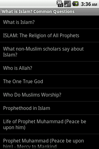 IslamMuslimMuhammadReligionAllahGodJesusHijabTerrorismJihadWomenPeaceWhat is Islam?Recent world events have raised a general curiosity about Islam and its teachings. Tons of questions have been raised about Islam: What is Jihad?, is it a struggle to achieve peace or is it related to terrorism?, what about women? Second class citizens or equal to a man? Four wives?,What is the Quran all about? Who is this Allah that Muslims worship? Etc. etc.Though information about Islam is readily available online, not every website is teaching authentic information and not every scholar appearing in the media is reliable, thus the need for an app about Islam that supplies detailed info is authentic and is easy to use.Brief Introduction to Islam:Islam is not a new religion, but the same truth that God revealed through all His prophets toevery people. For a fifth of the world39;s population, Islam is both a religion and a complete way oflife. Muslims follow a religion of peace, mercy, and forgiveness, and the majority have nothingto do with the extremely grave events which have come to be associated with their faith. Application contains following main topics1. Common Questions2. Islam for Peace3. Hot topics4. Ask your question5. Quranic verses6. Glossary of Islamic terms7. Sayings of Prophet Muhammadp8. Free stuff9. Audios10. Videos Common Questions1. What is Islam?2. ISLAM: The Religion of All Prophets3. What nonMuslim scholars say about Islam?4. Who is Allah?5. The One True God6. Who Do Muslims Worship?7. Prophethood in Islam8. Life of Prophet Muhammad Peace be upon him9. Prophet Muhammad Peace be upon him Mercy to Mankind10. The Most Influential Person in History11. The Message of Prophet Muhammad Peace be upon him12. What nonMuslim scholars said about Prophet Muhammed Peace be upon him13. Who is Your Role Model?14. Prophet Muhammad Peace be upon him The Only Hope of Mankind15. Jesus Peace be upon him16. How Did Jesus39; People Know Him?17. Who was Jesus?18. The Moral System of Islam19. Head Covers Hijab20. Life After DeathIn quot;Hot Topicsquot; following hot topics related to Islam are covered1. What does Islam say about Terrorism?2. What is the meaning of jihad?3. Human Rights in Islam4. What is the Islamic view on suicide, quot;mercyquot; killings and abortion?5. Status of Women in Islam6. Four wives?In quot;Sayings of Prophet Muhammadpquot; you will see few samples of sayings of Prophet Muhammadpbuh.quot;Free stuffquot; is only for our nonMuslim guests, following literature will be provided for this requestbased on availability.1. Quran english translation Saheeh international translation no arabic text2. Biography Biography of Prophet Muhammad, peace be upon him.3. The Message Magazine4. Book Clear your doubts about Islam Question and Answers about various Islamic topicsIn quot;Audiosquot; following topics are covered.1. Islamic Concept of God Dr. Bilal Philips2. Real Meaning of Peace Sheikh Abdur Raheem Green3. The True Message of Jesus Dr. Bilal Philips4. The Solution for Humanity Dr. Bilal Philips5. Muslim Contributions to Science Imam Shabir Ally6. Islam Womens Ideal Liberation Yvonne Ridley7. Muslims Misguided or Misunderstood Gary Miller8. How to get peace and joy in life Sheikh Yasir Qadih9. Why believe in the hereafter? Abdullah Hakim Quick10. The Truth about Holidays Abdullah Hakim QuickIn quot;Videosquot; following topics are covered.1. Proof of Islam2. Preservation of the Qur39;an3. Oral transmission of the Qur39;an4. Preservation of the sayings of the Prophet5. The miracle of the Arabic language6. Stories of those who heard the Qur39;an7. Embryology in the Qur39;an8. Scientific facts in the Qur39;an Part 19. Scientific facts in the Qur39;an Part 210. Historical facts11. Witness of the people of the Book12. Muhammads in the Bible Part 113. Muhammads in the Bible Part 214. Prophecies of the Prophetpbuh15. Signs of the Last Day