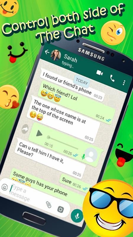 Dengan Palsu Obrolan Percakapan membuat dan berpura-pura WhatsApp palsu Percakapan dengan teman-teman Anda dan Nikmati Membuat Fun dari Teman Anda! Bos Anda sekarang akan percaya Anda tidak terjawab bekerja karena kau sakit!