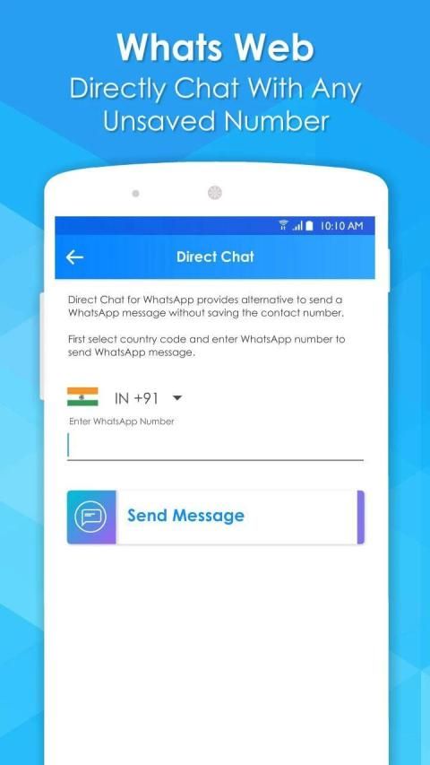 Anda dapat langsung mengobrol dengan nomor apa pun tanpa menyimpannya di daftar kontak Anda. cukup pilih kode negara dan masukkan nomor dan Anda siap untuk pergi. Mengobrol dengan siapa pun tanpa menyimpannya di daftar kontak Anda.