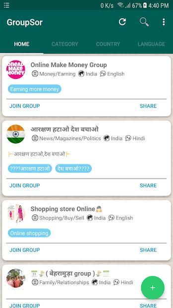 Groupsor is best WhatsApp group joining Android application. We have large amount of public WhatsApp groups invite links. Groupsor provides facility of easily join WhatsApp group and promote WhatsApp group for free of cost. GroupSor user can join unlimited WhatsApp groups without any kind of disturbance. You can join WhatsApp group by Country, Category and Language wise.