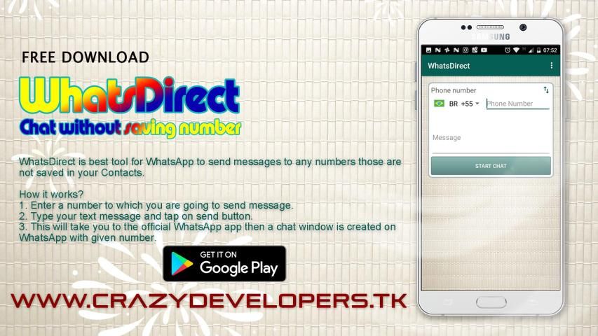 WhatsDirect is best tool for WhatsApp to send messages to any numbers those are not saved in your Contacts.