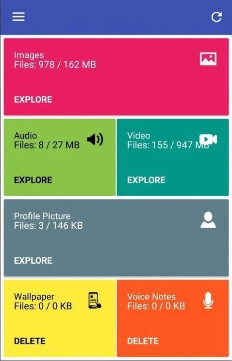 - See a list of images, audio, videos, voice notes, profile pictures, backups and wallpapers and delete any of them.