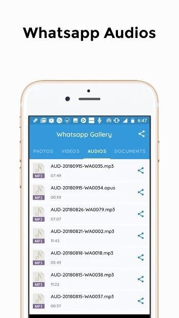 Sekarang, Anda dapat bekerja dengan file-file Whatsapp dengan sangat mudah dari galeri melalui aplikasi ini. Anda dapat dengan cepat dan mudah mengakses semua foto, video, audio dan dokumen Anda.