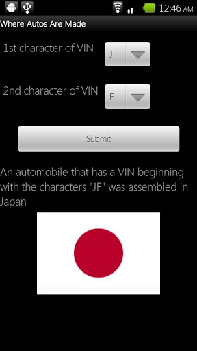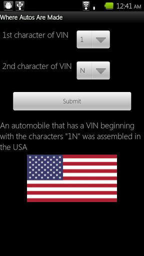 find out if your ford was made in the United States or if your Honda was made in japan with quot;where Automobiles are Madequot;.Given the first two characters of a VIN vehicle id. number this app will tell you what country that vehicle was assembled in.Works with all makes and models from all countries.