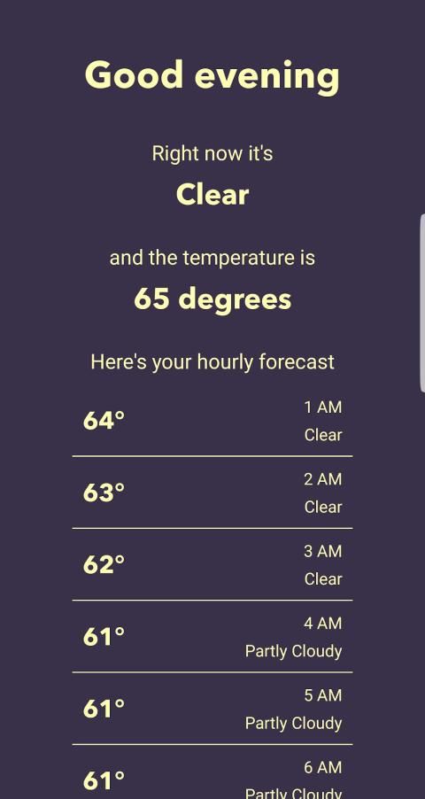 Whether is a modern, sleek, minimal weather app. It gives you only what you need to know -- a look at the current weather and changes over the next few hours.