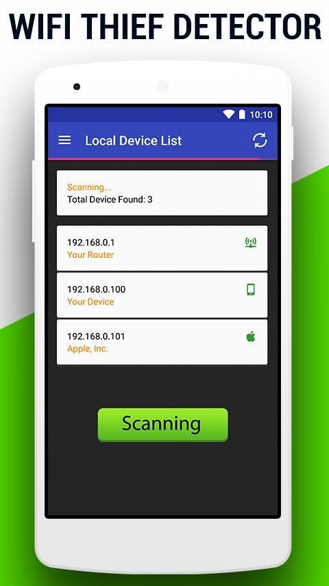 detektor wifi Hacker menawarkan layanan scan, ping dan bangun pada layanan LAN untuk perangkat yang terhubung. Layanan pemindaian menemukan ratusan port yang terbuka dalam sekejap, sementara Ping memahami kinerja jaringan Anda. Menggunakan bangun pada LAN Anda dapat beralih pada perangkat Anda dari ponsel atau tablet. Menggunakan aplikasi ini, tak seorang pun akan mencuri koneksi internet Anda lagi!