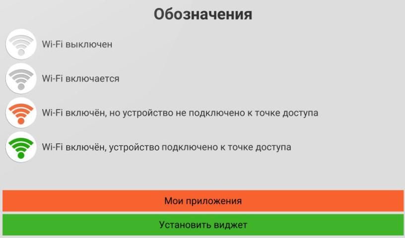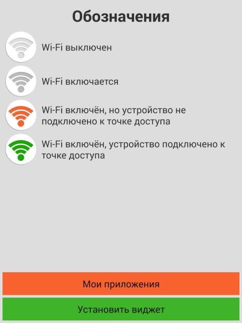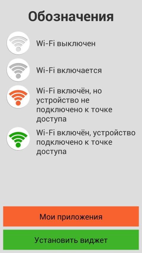 Sederhana dan mudah digunakan widget dalam bentuk tombol, dengan mana Anda dapat mengontrol keadaan Wi-Fi. Tergantung pada kondisi tombol Wi-Fi akan menganggap warna yang berbeda.