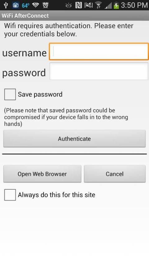 If at this point app finds unfilled fields in the web form for username and password or e-mail, it will prompt user for the same if the device is unlocked, otherwise wifi will be disable to keep it connected to Internet, and notification will be posted to the notification bar. Clicking on such notification will open the form to enter data, and re-attempt the authentication.
