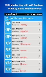 Wifi Master key & WiFi Analyzer works as "WiFi Password recovery" and gives you all saved wifi passwords for WiFi Networks You've connected to Your Android Device previously.This is not a WiFi password hacker app.It is useful in recovering wifi master key or WiFi password recovery for WPA WPA2 psk wep and other network securities. Wifi Master key won`t work without root.