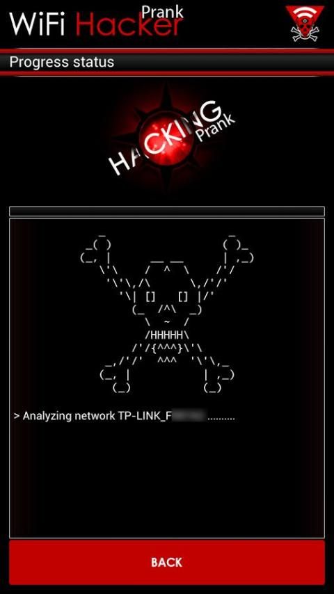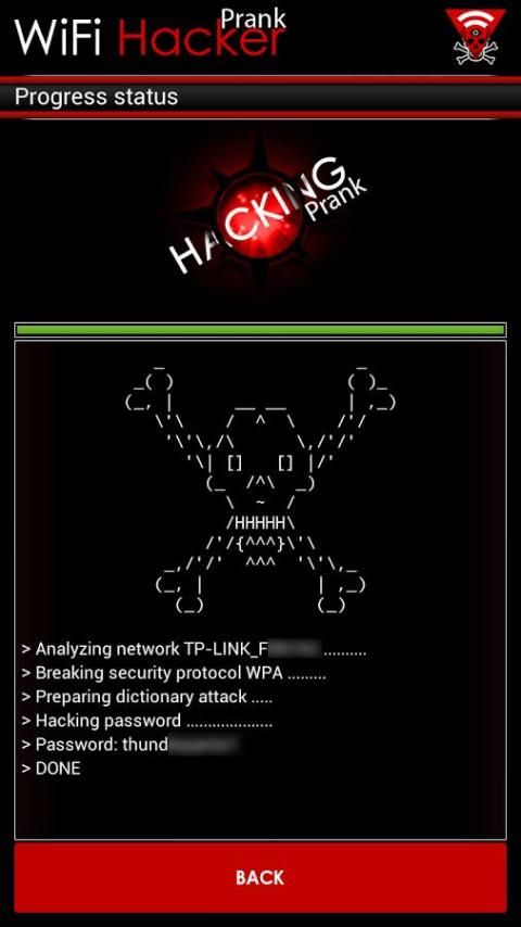 WiFi Hacker Prank memindai jaringan wifi yang tersedia dan menampilkan informasi keamanan tentang mereka. WiFi Hacker Highligts router dengan proteksi yang berpotensi lemah. Hacking dimulai ketika Anda menekan pada jaringan wifi dalam jangkauan. A mencari kotak hitam menakutkan muncul dan berpura-pura untuk memecahkan perlindungan jaringan.