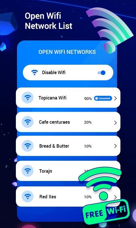 Temukan WiFi terbuka terdekat & daftar WiFi aman dengan informasi lengkap setiap koneksi WiFi tersedia. Daripada memilih untuk terhubung ke koneksi WiFi paling andal, kekuatan sinyal maksimum untuk pengalaman internet terbaik dari daftar WiFi yang tersedia.