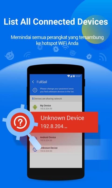 Memindai semua perangkat yang tersambung ke hotspot WiFi Anda, termasuk Ponsel Android, iPhone/iPad, PC. Menampilkan MAC dan merek perangkat secara terperinci, sehingga Anda dapat mengetahui siapa yang memakai WiFi dan memperlambat kecepatan jaringan Anda. Anda juga dapat mengevaluasi tingkat keamanan, mendeteksi penyusup dan mengatasi semua jenis masalah jaringan.