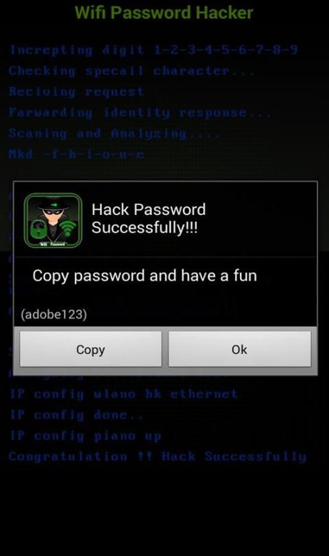 Ini adalah aplikasi wifi hacker untuk bersenang-senang. WiFi Sandi Hacker membuatnya tampak seperti Anda dapat hack jaringan WiFi. Hal ini dapat berpura-pura hacking ke jaringan wifi dijamin menggunakan WEP, WPA2 enkripsi AES atau dan sebagainya. Itu hanya menyajikan animasi mewah dan tidak ada yang lain. Sehingga tidak berbahaya bagi jaringan.