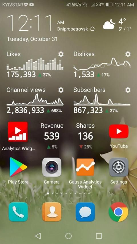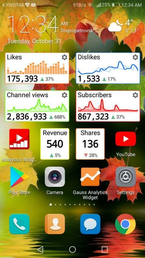 Widget dengan penuh YouTube Analytics konfigurasi yang fleksibel pada skema warna untuk antarmuka pengguna memungkinkan untuk memasukkannya ke setiap desain layar utama Android.