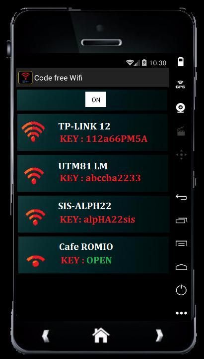 Gratis kode Wifi memiliki scanner jaringan Wifi dari setiap wifi sandi-booster. Membuka aplikasi, klik tombol ON dan melanjutkan ke koleksi daftar Wi-Fi. Klik jaringan pilihan. Tujuannya adalah untuk menghasilkan kode Wifi gratis, tapi teman-temannya berpikir jelas hack-nya wifi password recovery.