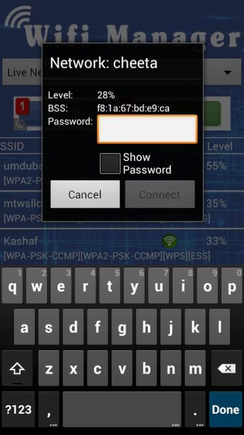 Aplikasi ini, Wi-Fi Manajer & Analyzer membantu Anda menemukan, menghubungkan dan mengelola jaringan Wi-Fi pada perangkat Anda. Hanya tekan pada jaringan yang sudah dikonfigurasi, klik connect dan atau tekan koneksi yang tersedia, masukkan password dan memulai. Aplikasi ini juga akan membantu Anda melihat jaringan Wi-Fi diurutkan berdasarkan kekuatan sinyal dan terhubung ke jaringan terbaik.
