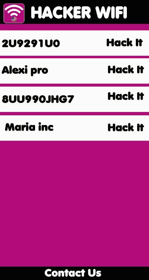 Pilih id dari salah satu sistem wifi dari kumuh ini. Setelah simulasi peragaan hacking palsu diproduksi kata rahasia akan ditampilkan, seolah-olah sistem tujuan dipecah menjadi. Melihat bagaimana tertegun sahabat Anda dengan kemampuan programmer Anda dan menghargai!