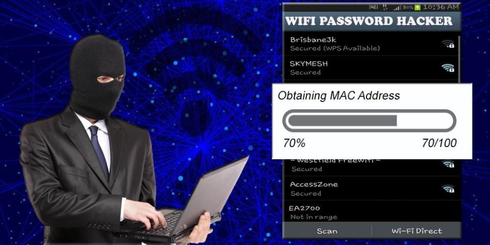 Wifi Sandi Hacker menunjukkan animasi palsu yang menganalisis info wifi dan proses melanggar.
