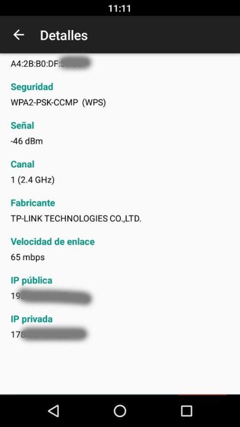 Dalam rincian setiap wifi, dapat mendeteksi SSID, alamat MAC dari router, jenis keamanan, kekuatan sinyal, saluran dan produsen router. Juga dalam waktu itu kita terhubung ke wifi, kita bisa melihat kecepatan link, IP publik dan IP pribadi.