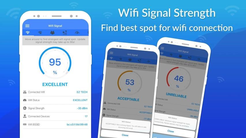 Your position may affect to wifi signal, with our app you can find the best spot to connect with maximum wifi strength.