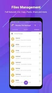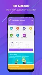 Key Features of Wonder File Manage★ Full-featured File Manager (Explorer)This pro Android file manager and explorer provides full-featured file management, including cut, copy, paste, move, delete, rename, check detail, share files, etc. for internal memory and SD card. It works perfectly as file renamer and viewer as can open any file format.★ Super Fast File TransferWith build-in wifi file transfer, this free file manager and explorer exploits wifi & hotspot to transfer files to another phone and PC even without internet connection. Without limitation for file size and type, users can transfer any file including apps, video, music, picture, etc. super fast.★ Storage Analysis & Junk File CleanIntelligently, this pro file manager will analyze storage usage, detect large files, redundancy files, and newly-created files. Therefore users can make sense of storage usage, clean junk file and other files & folders that are no longer needed effortlessly.★ File SearchThe optimized search engine of file explorer will find file in internal storage and SD card in 1 second. And users can browse files by category, e.g. image, music, video, apps, etc.★ Private & SafeThis free file manager and explorer provides 100% local file management. Therefore there is no risk of any file leak. Your files and information are completely safe.