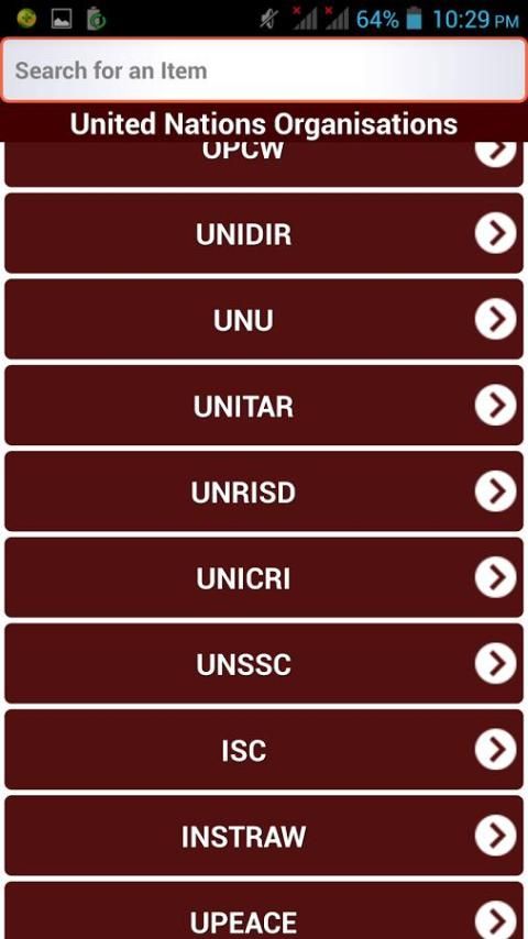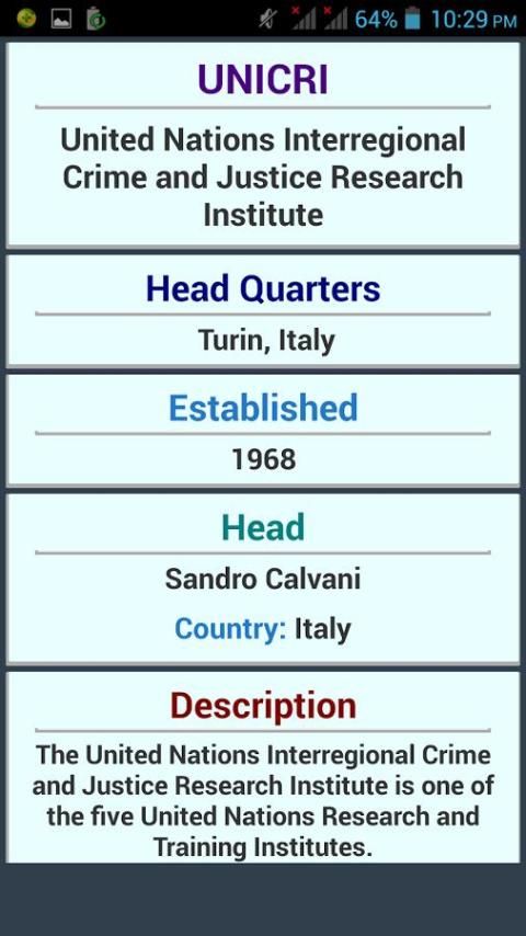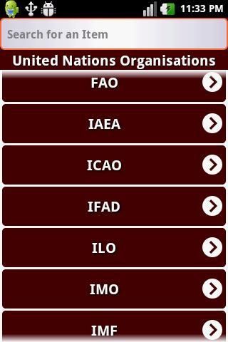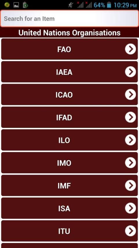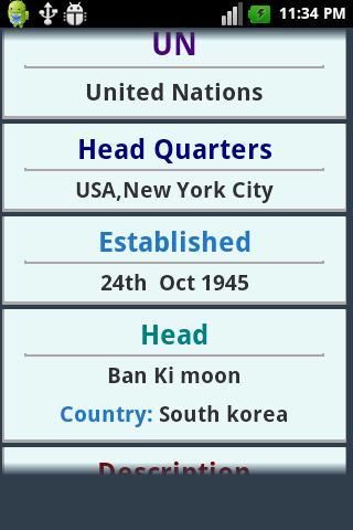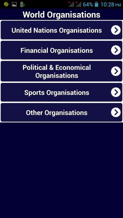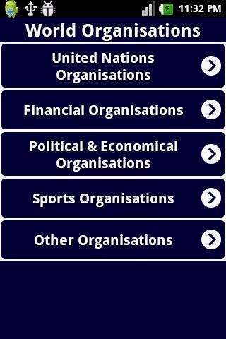 Aplikasi ini digunakan untuk mengetahui tentang semua jenis Dunia Organisasi seperti PBB, Keuangan, Politik dan Ekonomi, Olahraga, dll.,. Hal ini Memiliki Antarmuka Pengguna Bagus untuk belajar cepat. Ini menyediakan fungsi pencarian sehingga u dapat dengan mudah mencari apapun organisations.So Dunia itu sangat berguna untuk semua jenis orang. Digunakan untuk Knowledge.It umum terutama digunakan untuk Ujian kompetitif dan juga pengetahuan moderat pada dunia organisations.Used untuk anak-anak mengetahui tentang organisasi besar di dunia.