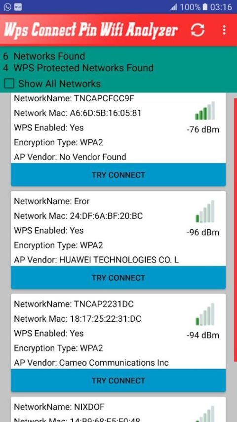 Akhirnya mereka dengan centang hijau rentan (pada prinsipnya), mereka memiliki therouters WPS pin protokol diaktifkan dan pin untuk menghubungkan ke jaringan diketahui. Hal ini juga mungkin bahwa router dimatikan WPS tetapi password diketahui, dalam kasus ini juga tampak hijau dan Anda dapat terhubung dengan kunci.