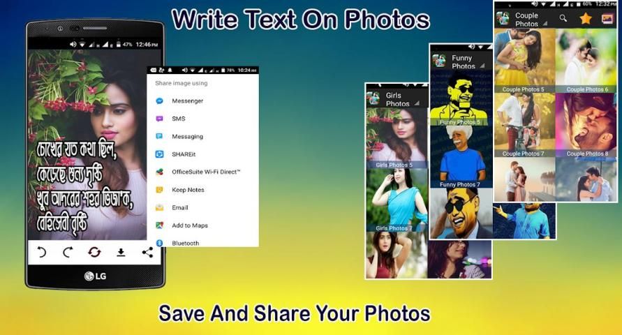 Welcome to my new Bengali Text On Pictures application. You can Write Bangla Shayari, Your Name on photo in Bangla, Bangla Poetry, Bangla Suvichar, Bangla Gazal, Bangla Jokes, Bangla Poem and Messages easily with the help of Bangla keyboard on your selected photo from gallery. Bengali Text On Pictures create application that allows best photo text creator photo with many items photo or image frames, with a simple interface and easy to use, it is a generator of wonderful photo with high definition (HD). Bengali text on photo Creator provides effects and design will give you the best experience of photo or image creator.