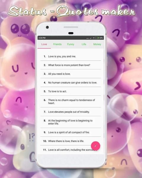 - Pembuat Status: ini adalah aplikasi terbaik untuk membuat Status - kutipan status banyak tersedia - kutipan tentang cinta, persahabatan, romantis, keluarga, lucu. Anda juga dapat membuat status Anda, tambahkan pada foto dan berbagi ke jaringan sosial.