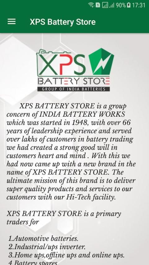 XPS BATERAI STORE adalah kekhawatiran sekelompok INDIA BATERAI KARYA yang dimulai pada tahun 1948, dengan lebih dari 66 tahun pengalaman kepemimpinan & melayani lebih lakh pelanggan dalam perdagangan baterai kami telah menciptakan goodwill yang kuat di pelanggan hati & pikiran. Dengan ini kita sekarang telah datang dengan merek baru dalam nama XPS BATERAI STORE. Misi utama dari merek ini adalah untuk memberikan kualitas produk & layanan super untuk pelanggan kami dengan fasilitas Hi-Tech kami.