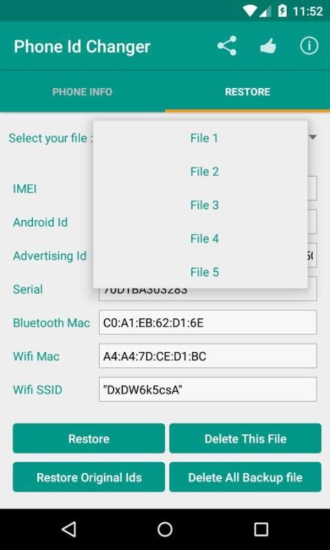 - Ubah nilai IMEI, Android Id, Serial Number, Wifi Mac Alamat dan service set identifier (SSID) dari jaringan wifi saat ini.