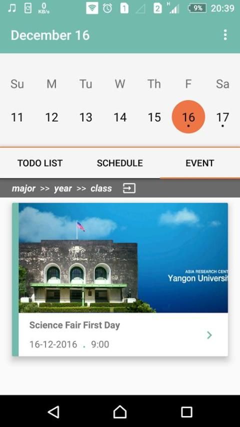 YU penting adalah sebuah aplikasi android yang membantu siswa dan guru mendapatkan informasi peristiwa dan kelas di Universitas Yangon. Dengan mendapatkan aplikasi ini pada ponsel android Anda, siswa dapat mengenal urusan universitas seperti tutorial, ujian praktis dan jadwal untuk semua 21 jurusan.
