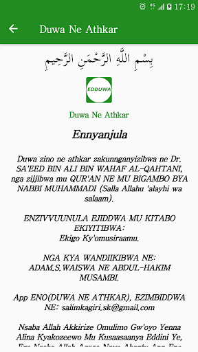 Edduwa and Athkar formerly called Yiga Edduwa has been adavanced according to uses' preference, it contains duas and and words of praise to Allah from the holy Qur'an and the saying of the prophet of Allah, Muhammad ((salla llahu 'alaihi wasalaamu). Every muslim is adived to use them in his daily life